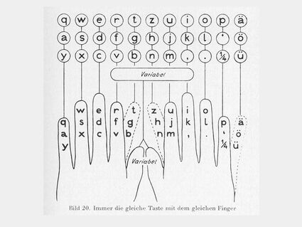 Fingerverteilung beim Satz mit der Monotype, aus Emil Lürssen, Die Monotype, Leipzig, 1954, S. 41, ID 3566