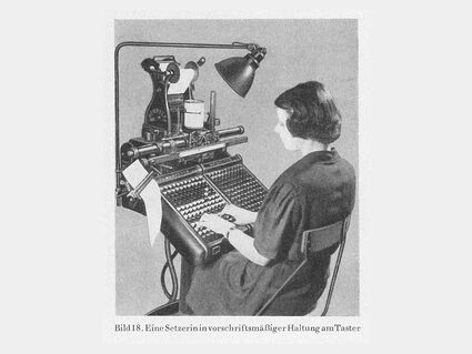 Arbeitsplatzsituation an einem Monotype-Taster, aus Emil Lürssen, Die Monotype, Leipzig, 1954, S. 37, ID 3566