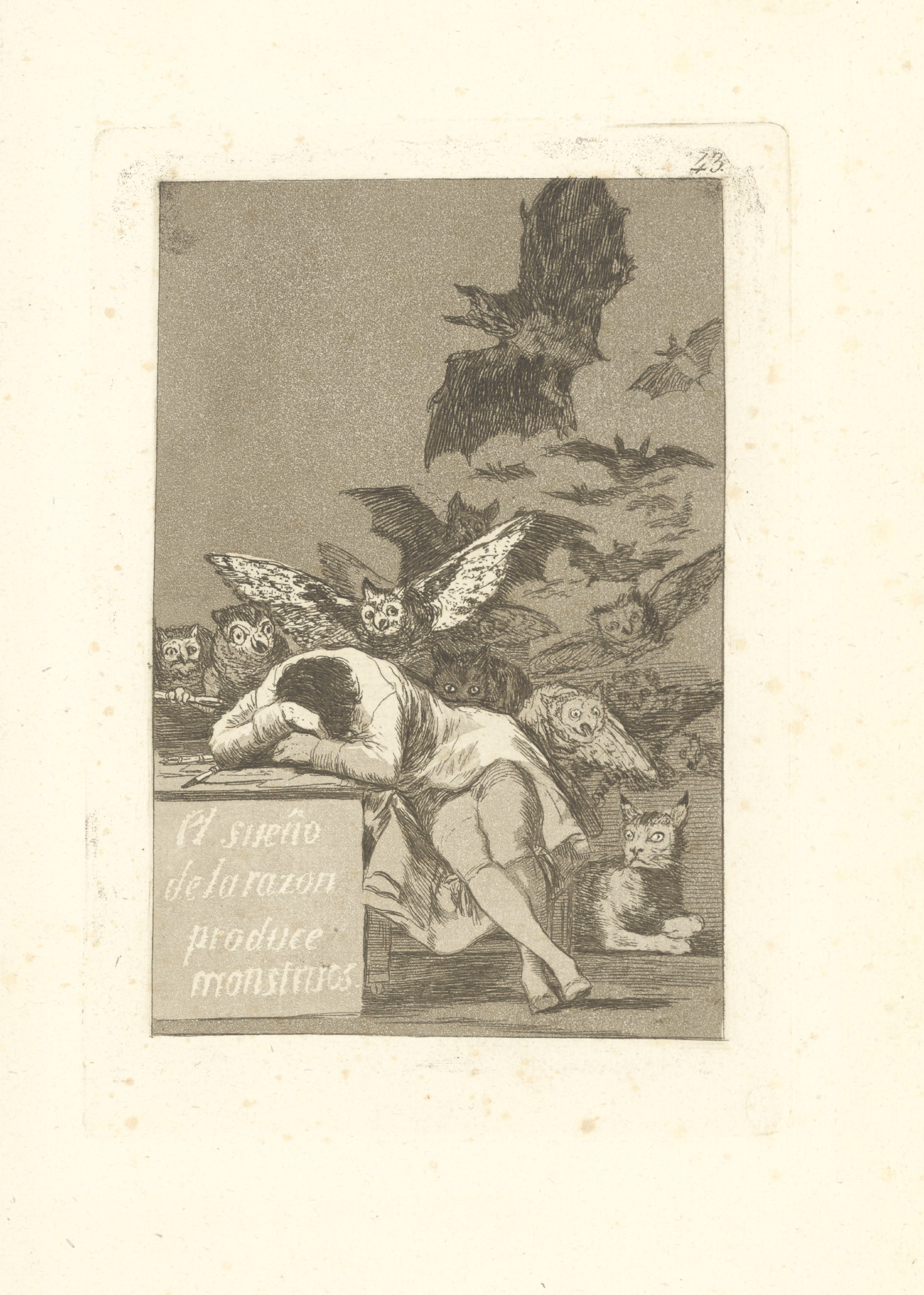 Bild: Francisco de Goya, El sueño de la razon produce monstruos. / Der Schlaf der Vernunft bringt Ungeheuer hervor. / The sleep of reason produces monsters., Radierung und Aquatinta, Blatt 43 der Folge Los Caprichos, 1. Auflage 1799, Museum der bildenden Künste Leipzig