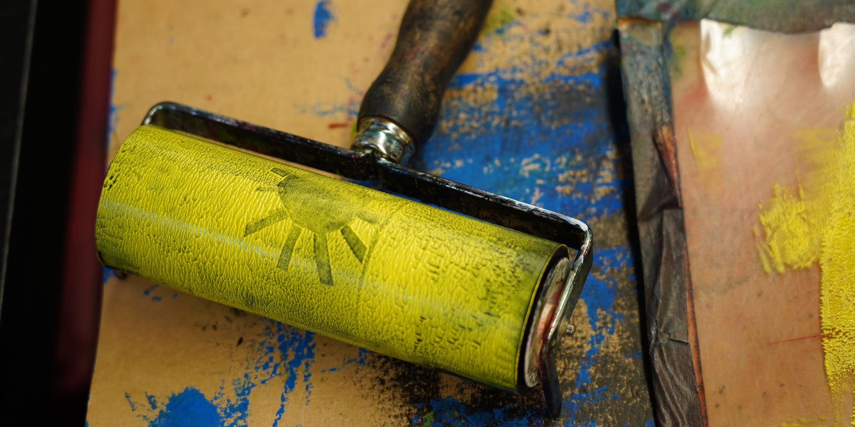 Mit Walzen und Stempeln erschaffen wir Muster und Strukturen. Alle nehmen am Ende eine kleine Sammlung bunter Drucke mit nach Hause. .
