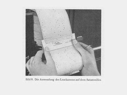 Kontrolle des Textes auf dem Lochstreifen mit einem Lesekamm, aus Emil Lürssen, Die Monotype, Leipzig, 1954, S. 19, ID 3566