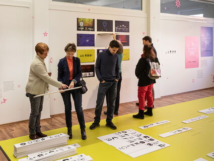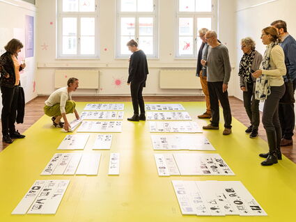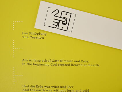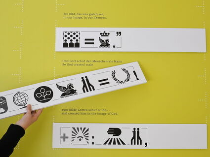 Die Berliner Gestalterin Juli Gudehus hat die biblische Schöpfungsgeschichte in einem von ihr erfundenen Bildzeichen-Esperanto nacherzählt. Jetzt kommt sie mit einem Riesen-Puzzle und vielen Piktogrammen, Icons und Symbolen ins Museum – Hieroglyphen unserer Zeit, die uns von Verkehrszeichen, Geräten und Bildschirmen vertraut sind. Flankiert von einem Sternenhimmel der besonderen Art sind Museumsbesucher eingeladen, Juli Gudehus’ »Genesis« als großes Bilderrätsel zu lösen und an der Entstehung einer möglichen Weltsprache aus Bildzeichen aktiv mitzuwirken.