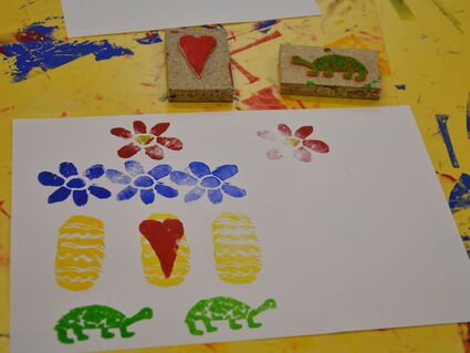 Aus Holz und Moosgummi stellen wir tolle Stempel her und probieren sie mit verschiedenen Farben gleich aus.