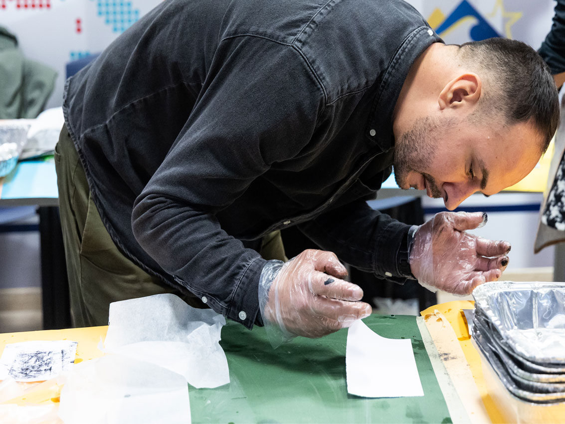 Die Technik nutzt natürlich vorkommende ölähnliche Rückstände auf Wasseroberflächen als Zeichenmaterial und bedient sich aufbereiteter Getränkedosen als Druckmatrize. Teilnehmende sind eingeladen, Drucken neu zu denken und dabei über Nachhaltigkeit, Material und unser Verhältnis zur natürlichen Umwelt praktisch zu reflektieren.