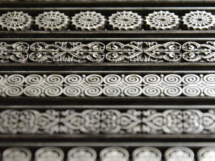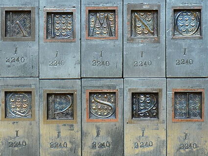It consists of lead and woodblock type, matrices, steel punches, and about forty tonnes of metal from the stocks of famous former type foundries or printing firms. Among the collection are hieroglyphs, cuneiform and Sanskrit types from the Reichsdruckerei (the Imperial Printing Works in Berlin) and a set of matrices of a gothic script by Jakob Sabon, cut before 1575, making it one of the oldest printing types preserved today.